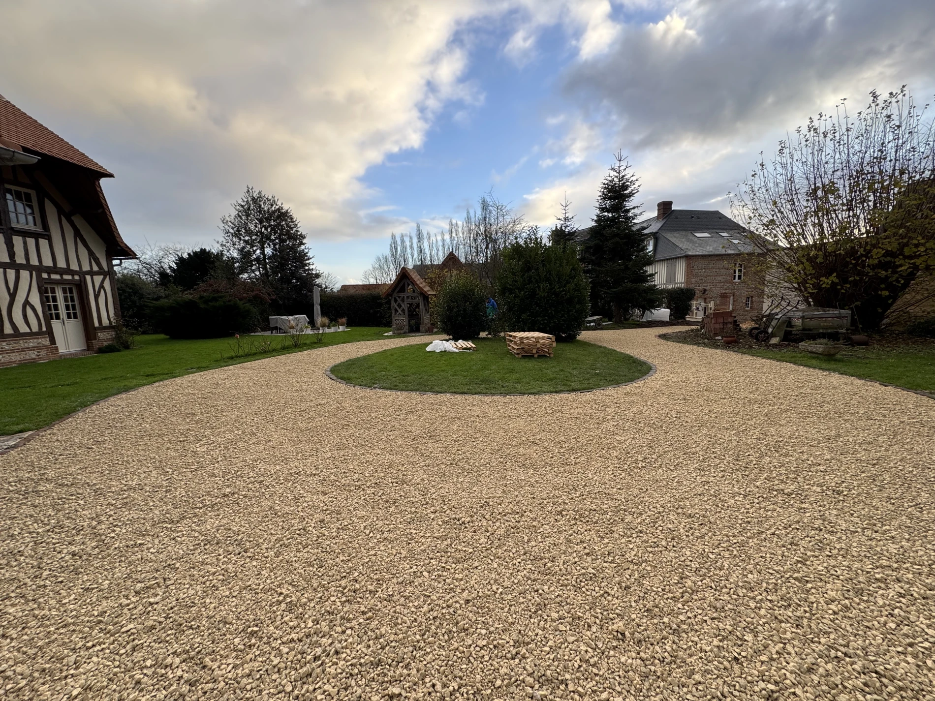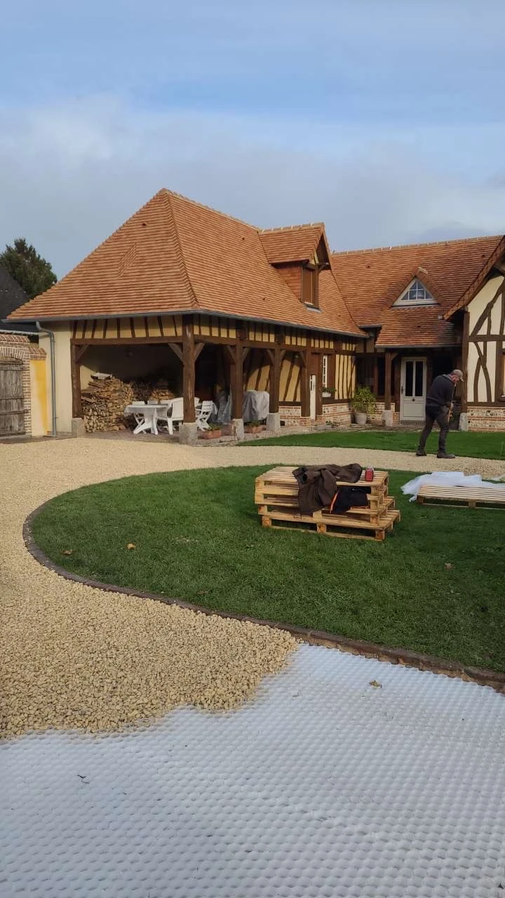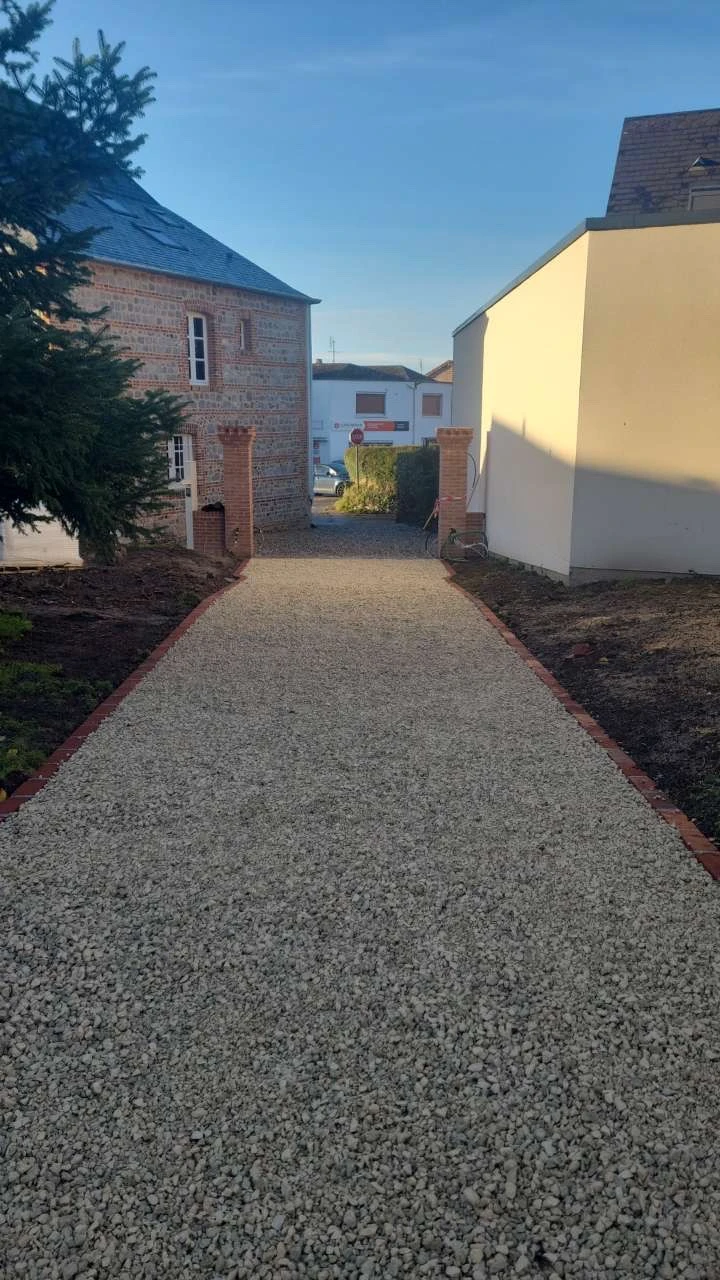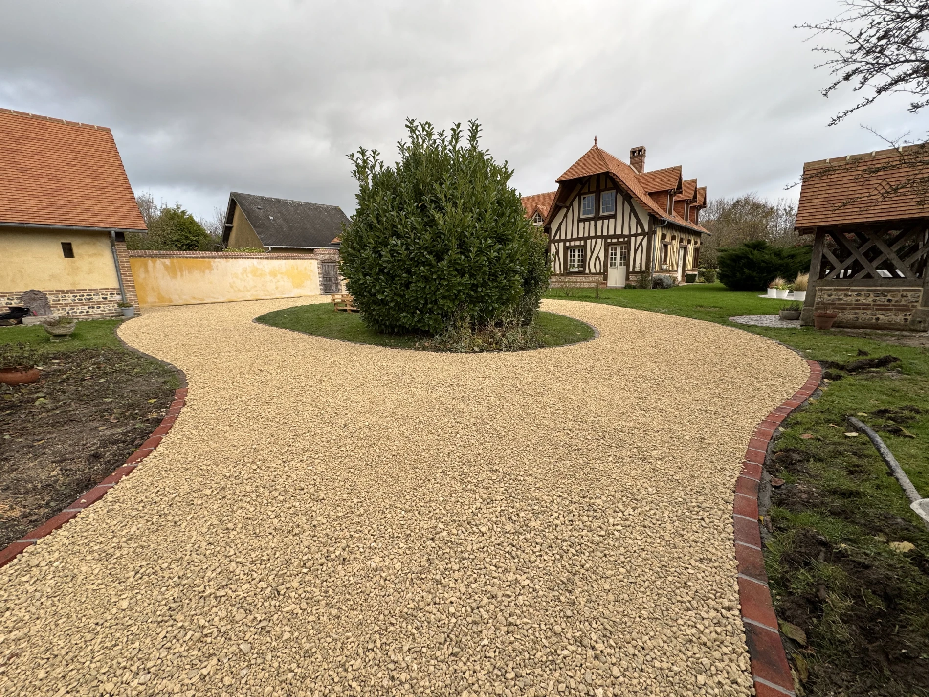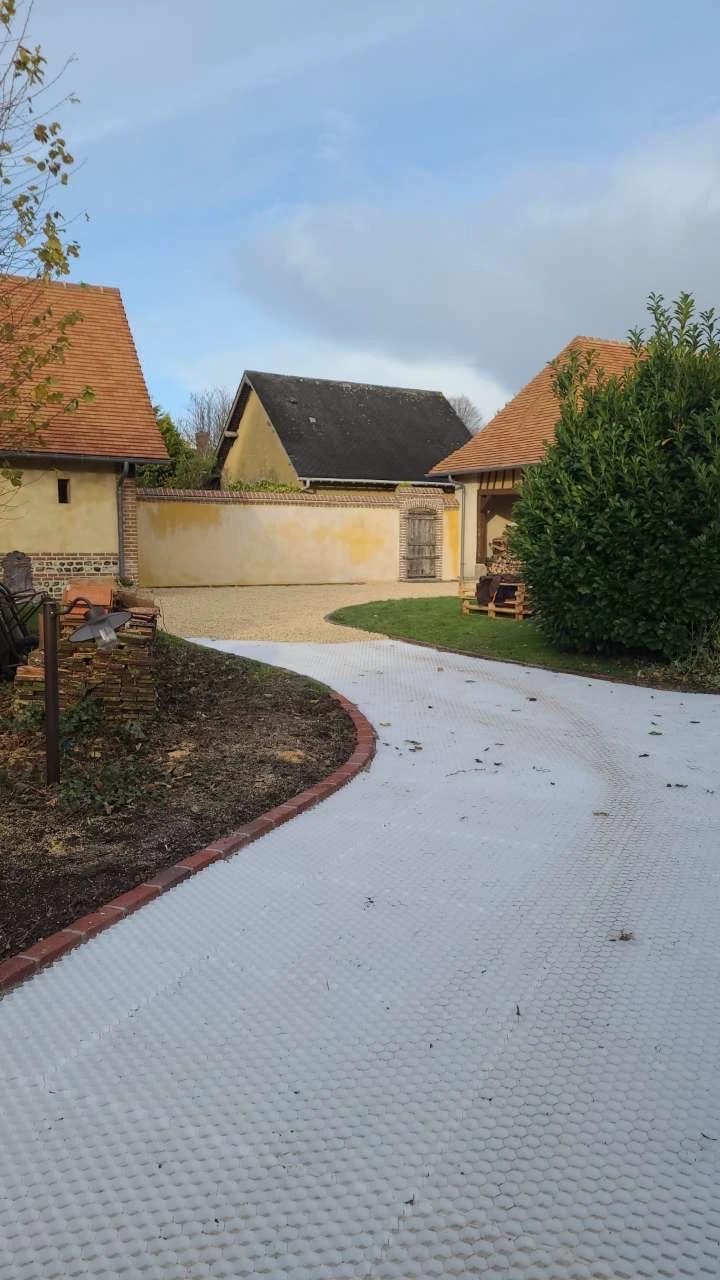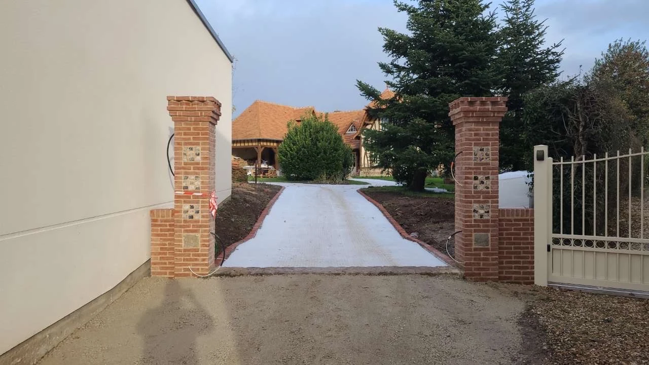 Dans le cadre de ce projet, nous avons réalisé l’aménagement complet d’un parking extérieur en dalles alvéolées. La délimitation en briques, posée en amont, permet de rappeler harmonieusement le style de la maison, tandis que la finition en gravelle calcaire apporte une touche naturelle et élégante.